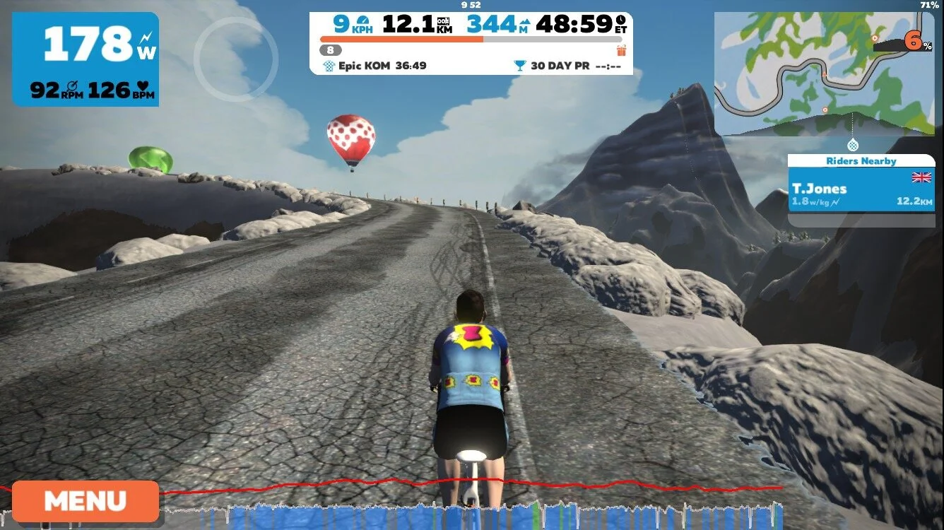 We spent Saturday morning at the gym. Just for once, Katie and I managed to get Wattbikes next to one another, both with working headsets, seat post clamps, pedals - even bluetooth! The final piece of the jigsaw, being able to see one another on Zwift, remained elusive, but we did an hour or so up the mountain towards our Le Col challenge hours, interspersed with some adult conversation and trips to the water cooler to combat the intense heat (none of which later). It hurled it down with rain so we went and got Rhoda some new trainers to ride in, and nipped to Cafe Ventoux for a bit of an outing and something to eat. Katie took the opportunity to see what she might spend her £50 Le Col voucher on - assuming we got some more time on the bike before the weekend was out.