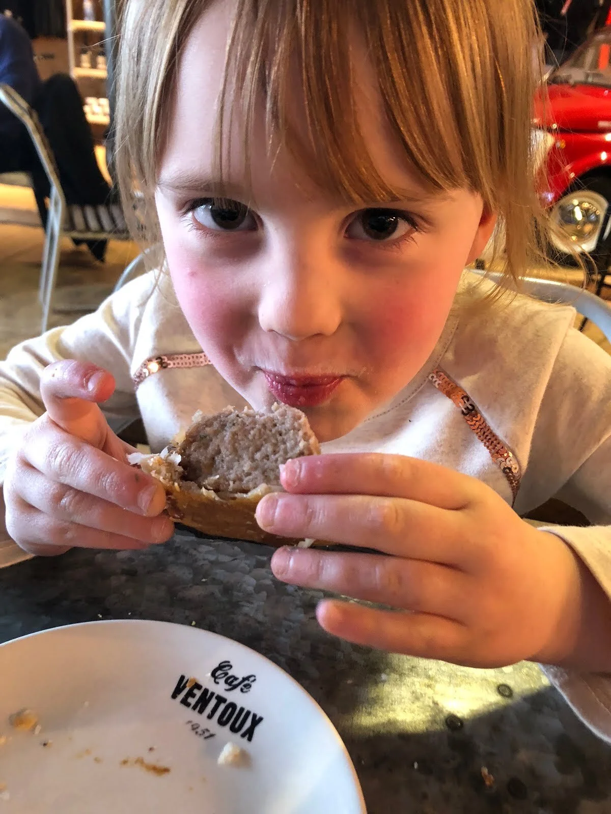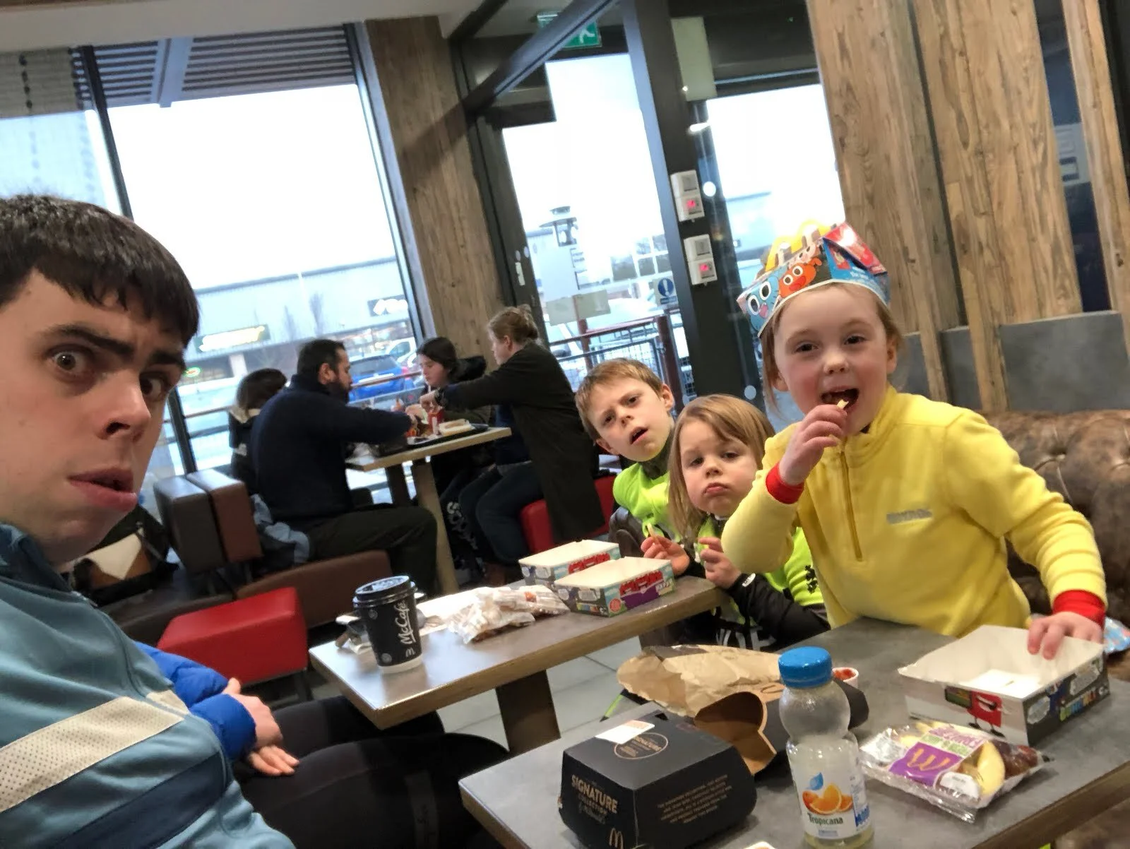 In the end, since all the jacket-searching had cost us so much time we were all 'hangry', we jumped in the car, all each one of us (except Ruth's top half) in full lycra, and went to a well known burger joint which euphemistically calls itself a 'restaurant' but is careful to enhance the eating experience by never bringing to your table everything you ordered. As we arrived there, we were treated to a hailstorm. Words were possibly had with the Almighty, who had apparently hogged the promised nice weather, for the part of the day we had spent indoors worshipping Him.