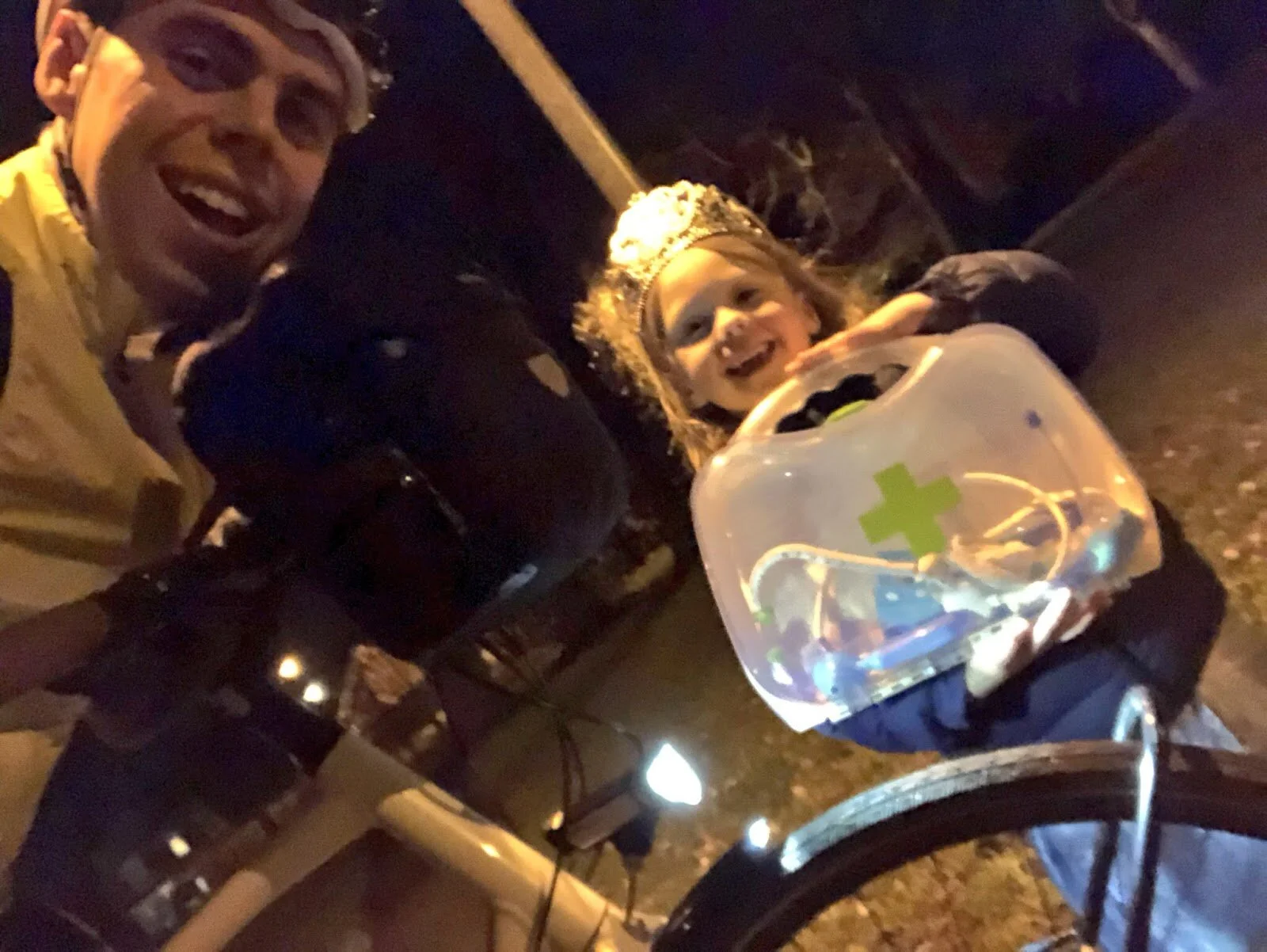 By the time I got home, it was cold, and dark, again. I had Ruth to look after, and so off we went to the bandstand with my tourer. I mean, what sort of home based challenge would this be if I didn't do a lap or two of the 'Secret Squirrel Velodrome'? Ruth, dressed as a Disney princess, helpfully brought her new doctor's kit, as well as her tiara, and stood by a lamppost cheering me on, measuring my blood pressure and giving injections of goodness-knows-what every few laps. The Early Learning Centre's EPO seemed to do the business** but despite her willingness to cheer me on, the little one got cold (unsurprisingly) and we had to retreat to the house. Still, it was more kilometres than I'd have got sat in front of the fire. 8.5 of them, in fact.